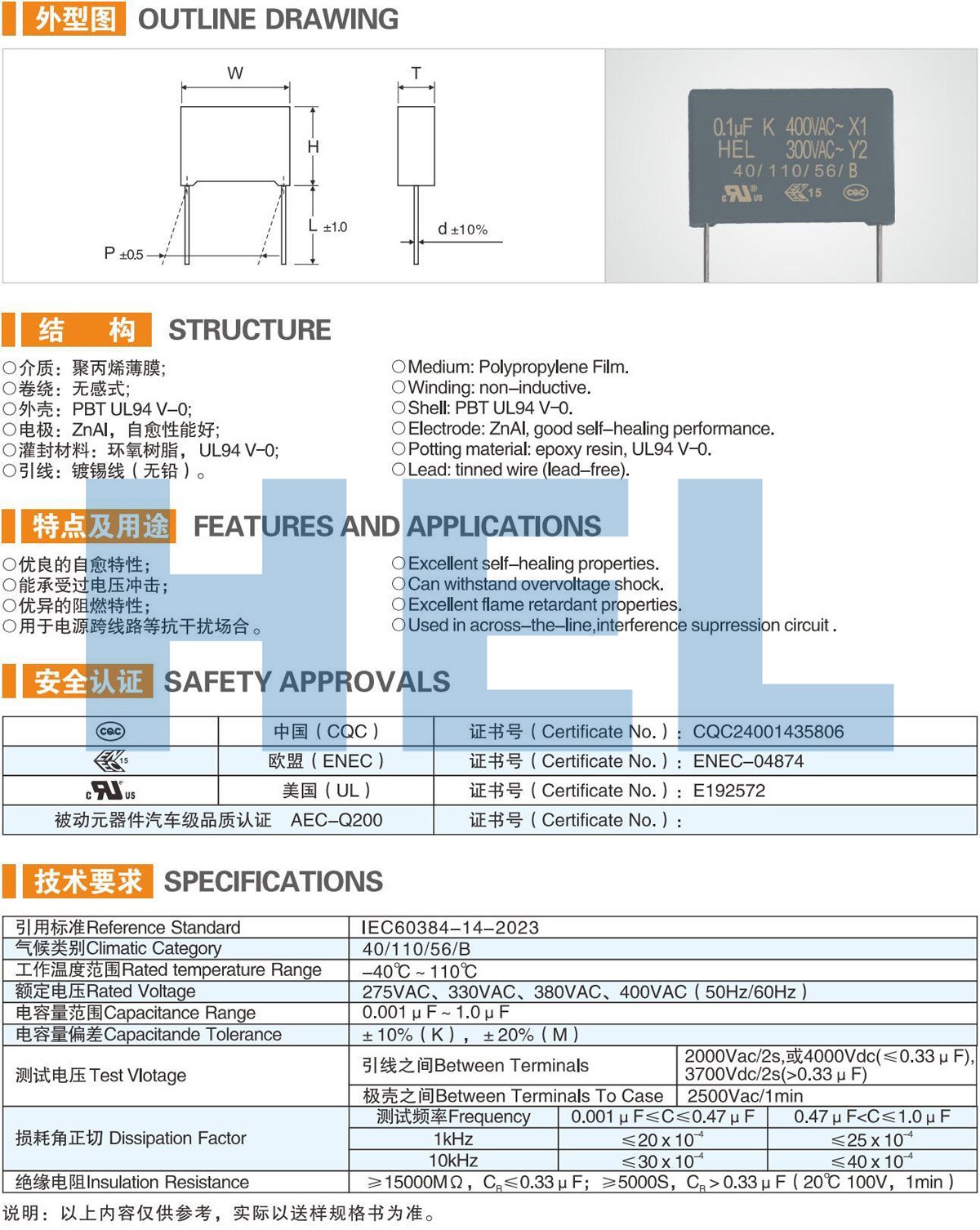 MPZ塑料外殼金屬化聚丙烯薄膜抗干擾電容器(X1)